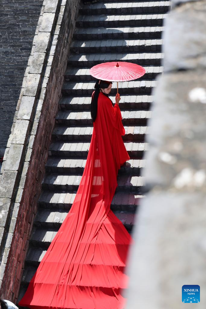 A tourist poses on the ancient city wall in Xi'an, northwest China's Shaanxi Province, Sept. 12, 2025. The 13.74-kilometer-long ancient city wall that surrounds Xi'an is one of the longest and best-preserved of its kind in China. A digital comprehensive management platform has been built for the wall since 2023, which integrates functions such as cultural relic protection, cultural tourism operation, emergency management, and flood-control command.