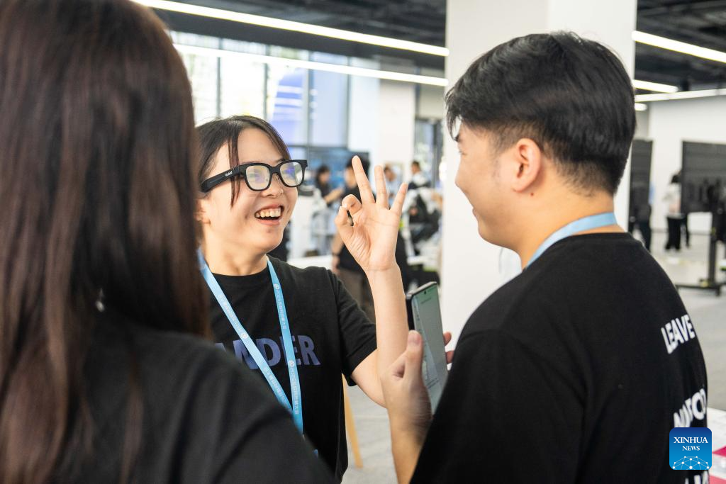 A visitor (C) tries on a pair of smart glasses at the Internet Yuelu Summit 2025 in Xiangjiang New Area of Changsha, central China's Hunan Province, Sept. 15, 2025. Focusing on cutting-edge technologies such as artificial intelligence, the summit kicked off here on Monday. (Xinhua/Chen Sihan)