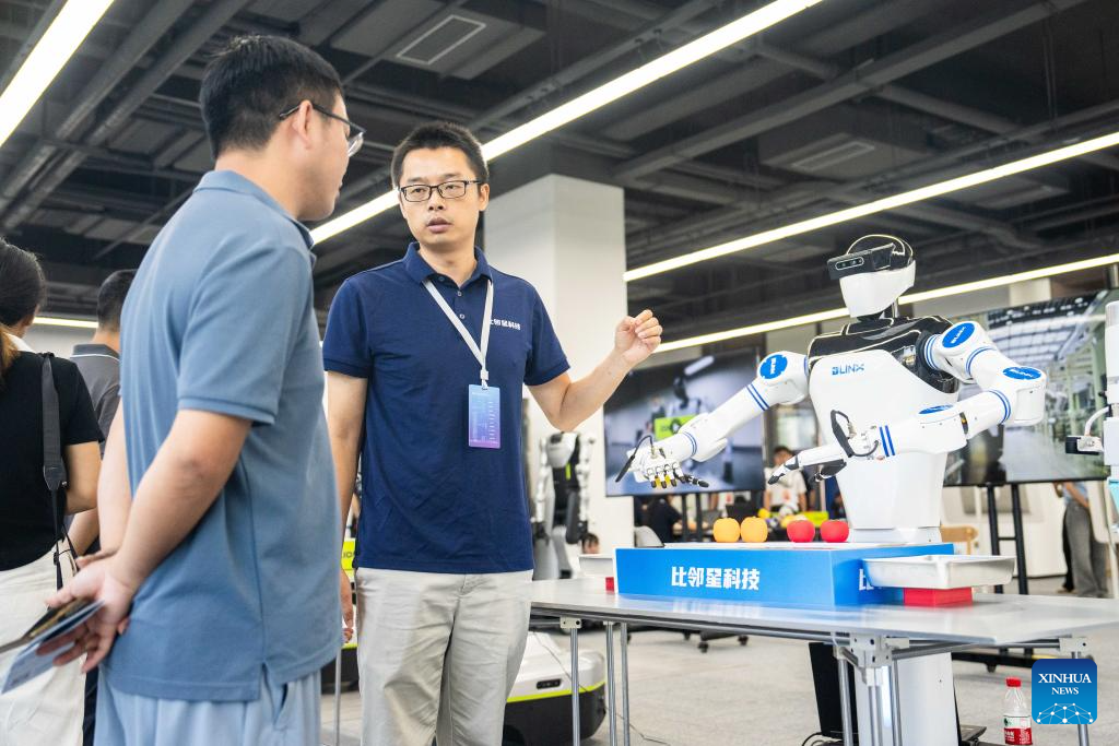 A staff member (R) introduces a humanoid robot capable of sorting items at the Internet Yuelu Summit 2025 in Xiangjiang New Area of Changsha, central China's Hunan Province, Sept. 15, 2025. Focusing on cutting-edge technologies such as artificial intelligence, the summit kicked off here on Monday. (Xinhua/Chen Sihan)