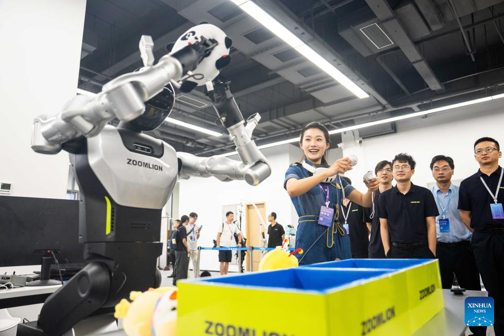 A visitor (C) operates a humanoid robot to grab a doll at the Internet Yuelu Summit 2025 in Xiangjiang New Area of Changsha, central China's Hunan Province, Sept. 15, 2025. Focusing on cutting-edge technologies such as artificial intelligence, the summit kicked off here on Monday. (Xinhua/Chen Sihan)