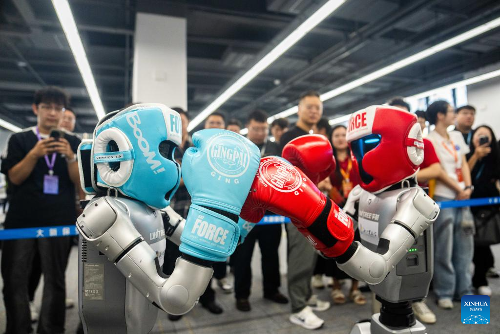 Visitors watch a humanoid robot boxing game at the Internet Yuelu Summit 2025 in Xiangjiang New Area of Changsha, central China's Hunan Province, Sept. 15, 2025. Focusing on cutting-edge technologies such as artificial intelligence, the summit kicked off here on Monday. (Xinhua/Chen Sihan)