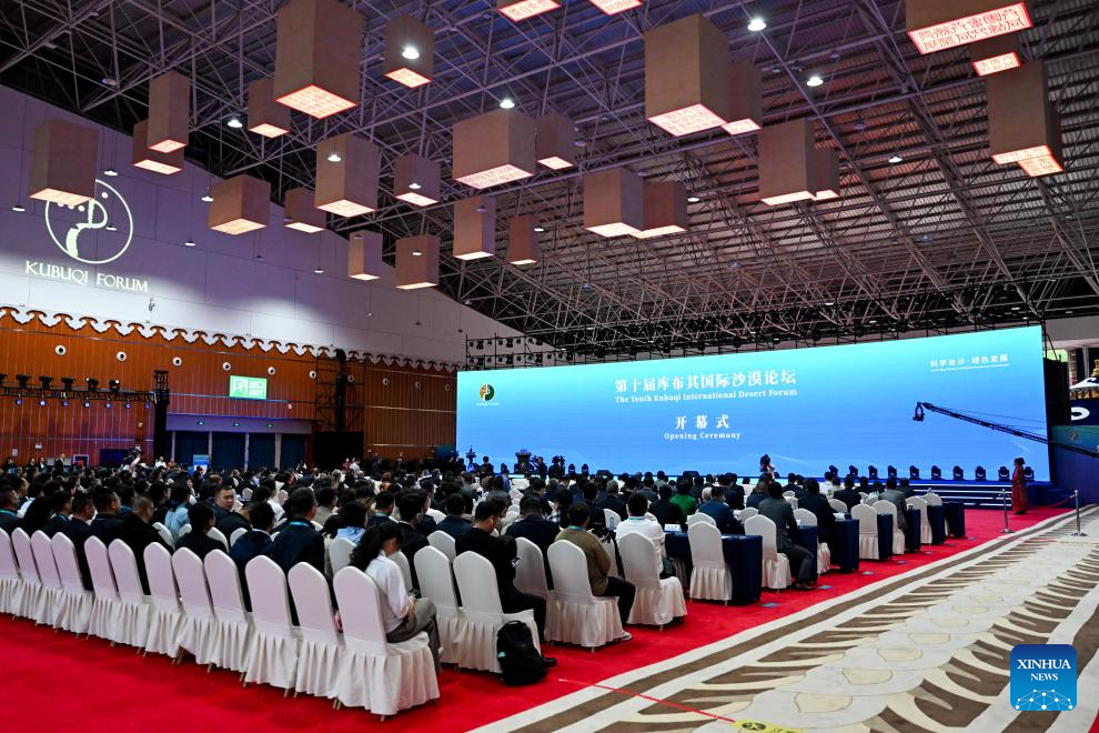 This photo taken on Sept. 16, 2025 shows the opening ceremony of the 10th Kubuqi International Desert Forum in Ordos, north China's Inner Mongolia Autonomous Region. The event kicked off here on Tuesday under the theme "Scientific Desertification Control, Green Development." (Xinhua/Li Zhipeng)