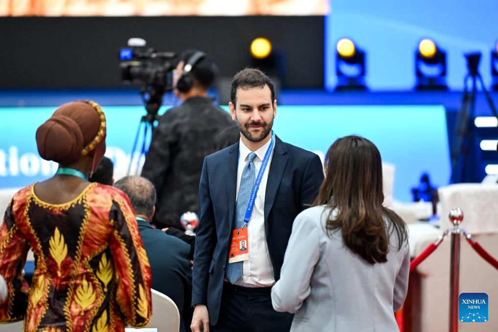 Attendees communicate before the opening ceremony of the 10th Kubuqi International Desert Forum in Ordos, north China's Inner Mongolia Autonomous Region, Sept. 16, 2025. The event kicked off here on Tuesday under the theme "Scientific Desertification Control, Green Development." (Xinhua/Li Zhipeng)