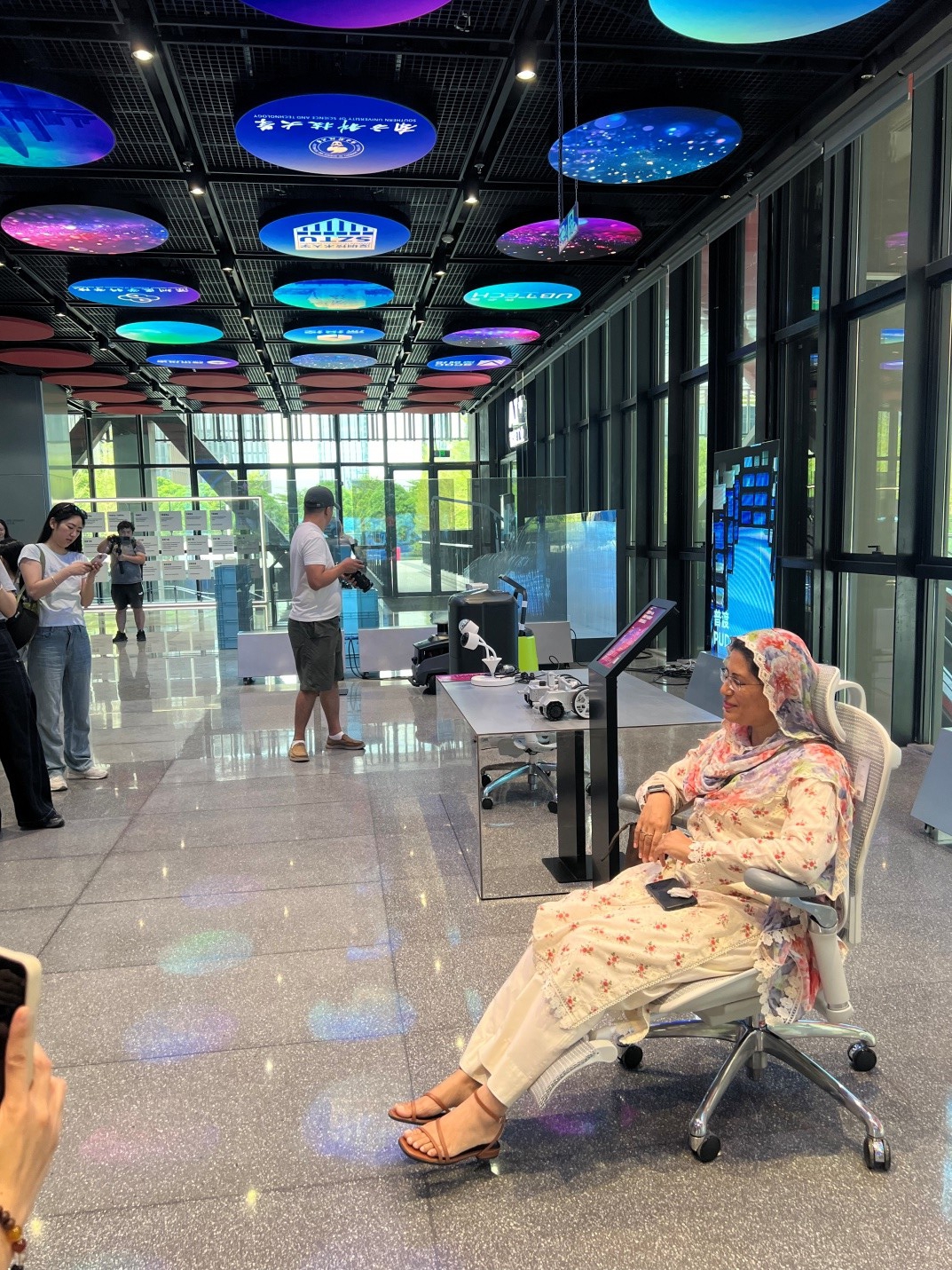 A reporter tests a chair that provides comfortable and ergonomic seating at the Qianhai Shenzhen-Hong Kong Youth Innovation and Entrepreneurship Hub, Sept. 15, 2025. (Photo/People's Daily Online)
