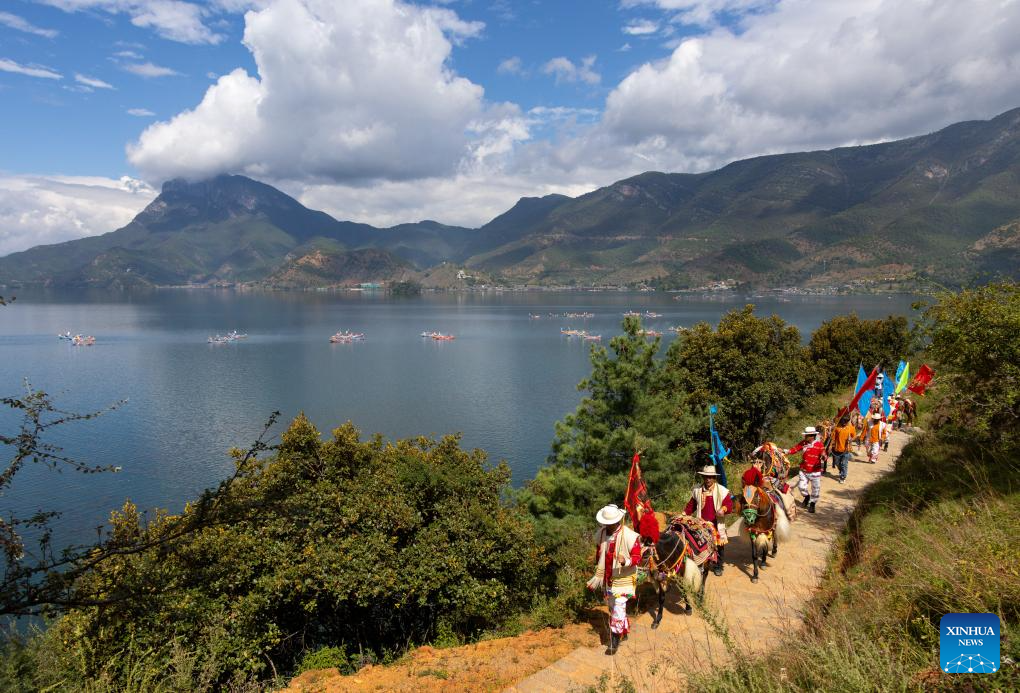 Local people herd horses while circling the mountain in Yanyuan County of Liangshan Yi Autonomous Prefecture, southwest China's Sichuan Province, Sept. 16, 2025. The first mountain and lake circling festival of Lugu Lake kicked off at Liangshan Yi Autonomous Prefecture on Tuesday. Mountain and lake circling is an important folk custom of the Mosuo people living near Lugu Lake. Starting this year, Liangshan Prefecture has officially designated the 25th day of the seventh lunar month as the mountain and lake circling festival, making it a local statutory holiday. Residents of Yanyuan and Muli counties can enjoy a one-day exclusive holiday. (Xinhua/Jiang Hongjing)
