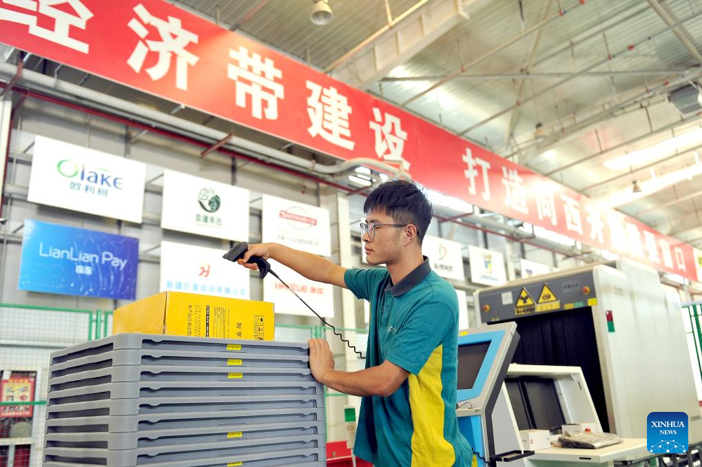 A staff member of China Post Kashgar Branch handles outbound international parcels at an international mail exchange station in Kashgar, northwest China's Xinjiang Uygur Autonomous Region, Sept. 11, 2025. Since the trial operation of this mail exchange station, delivery time for mails sent to Central Asia countries from southern Xinjiang has been shortened by 2 to 4 days than before. In recent years, the Xinjiang Branch of China Post has extended its postal services to local communities of remote area and border outposts. Additionally, it has built a high-quality agricultural product supply chain across the region, facilitating the sales of local premium agricultural products and contributing to rural revitalization.