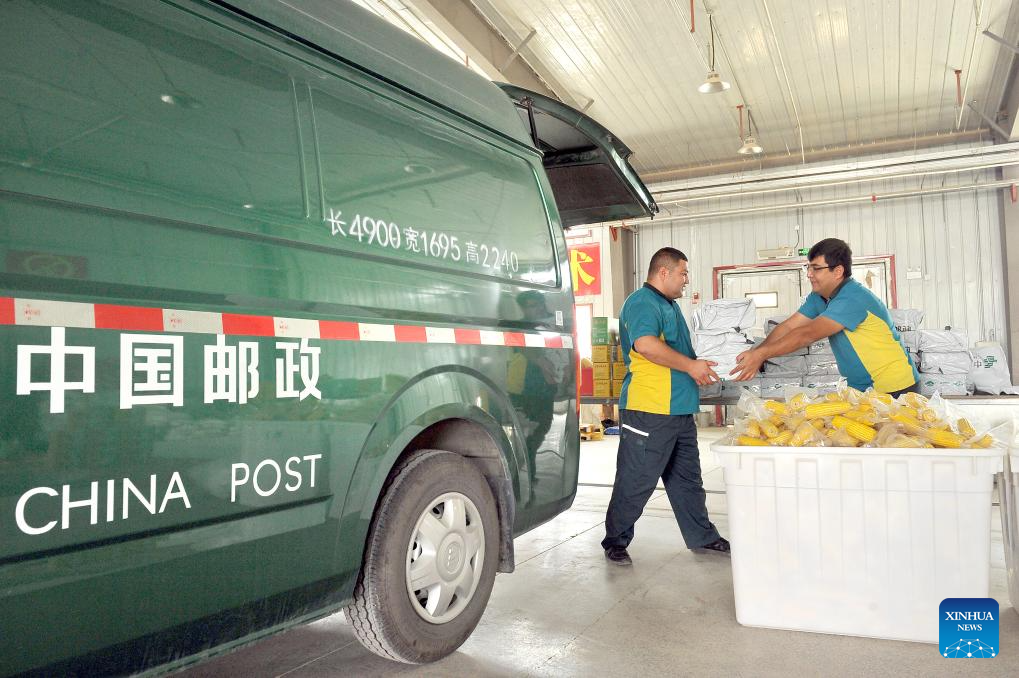Postal workers pack and tag corn at a cooperative in Yecheng County, northwest China's Xinjiang Uygur Autonomous Region, Sept. 10, 2025. China Post Xinjiang Branch has cooperated with local agricultural product companies to improve the transportation and sales of agricultural product so as to promote local development. In recent years, the Xinjiang Branch of China Post has extended its postal services to local communities of remote area and border outposts. Additionally, it has built a high-quality agricultural product supply chain across the region, facilitating the sales of local premium agricultural products and contributing to rural revitalization.