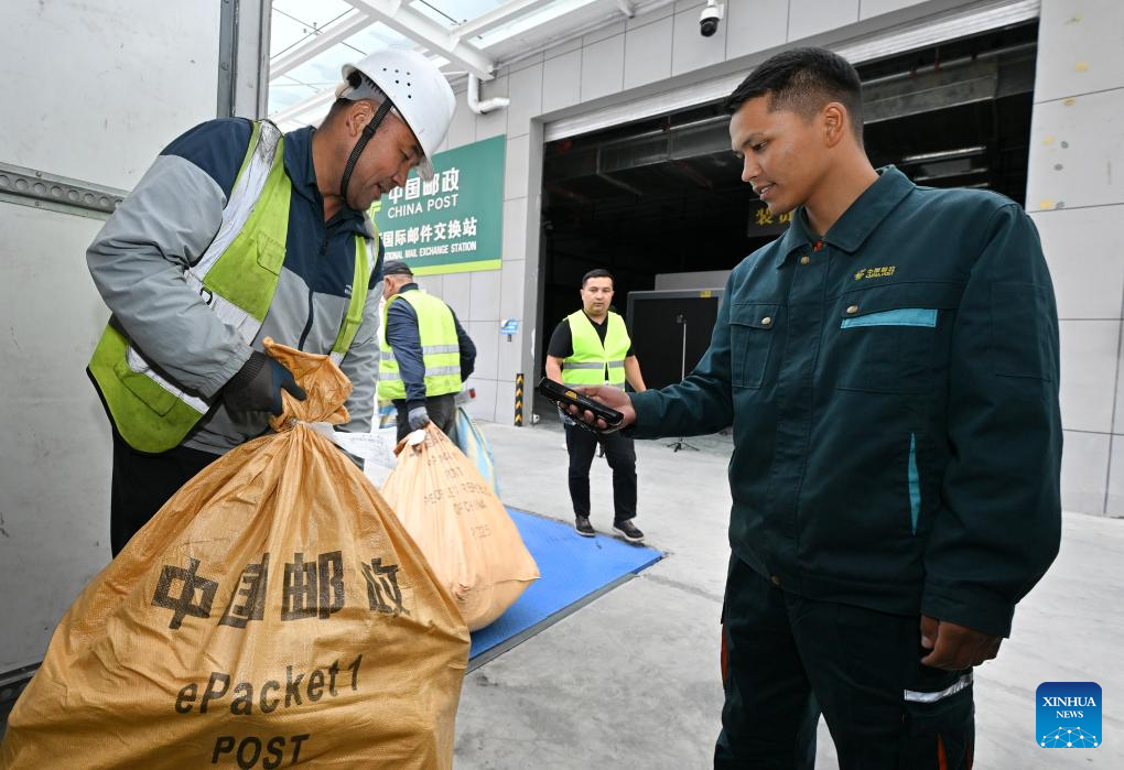 A staff member of China Post (1st R) handles parcels to be exchanged to Kazakhstan at an international mail exchange station in Horgos, northwest China's Xinjiang Uygur Autonomous Region, Sept. 11, 2025. The exchange station in Horgos was officially put into operation in July of 2022, providing comprehensive solutions for warehousing and logistics of cross-border e-commerce industry chain. Over the past three years, it has exchanged 2,026 tons of international mail in total. In recent years, the Xinjiang Branch of China Post has extended its postal services to local communities of remote area and border outposts. Additionally, it has built a high-quality agricultural product supply chain across the region, facilitating the sales of local premium agricultural products and contributing to rural revitalization.