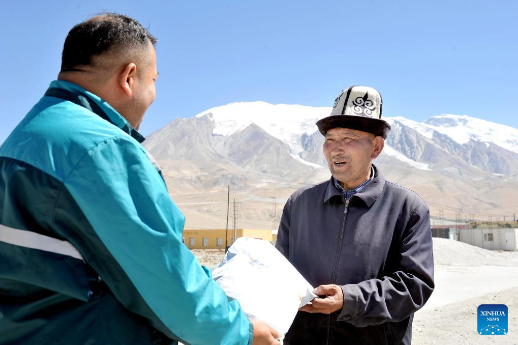 A postman (L) delivers a parcel to a villager in Bulungkol Village of Bulungkol Township, Akto County, Kirgiz Autonomous Prefecture of Kizilsu in northwest China's Xinjiang Uygur Autonomous Region, Sept. 9, 2025. People living in the border areas now can enjoy the same fast and convenient postal service as urban residents. In recent years, the Xinjiang Branch of China Post has extended its postal services to local communities of remote area and border outposts. Additionally, it has built a high-quality agricultural product supply chain across the region, facilitating the sales of local premium agricultural products and contributing to rural revitalization.