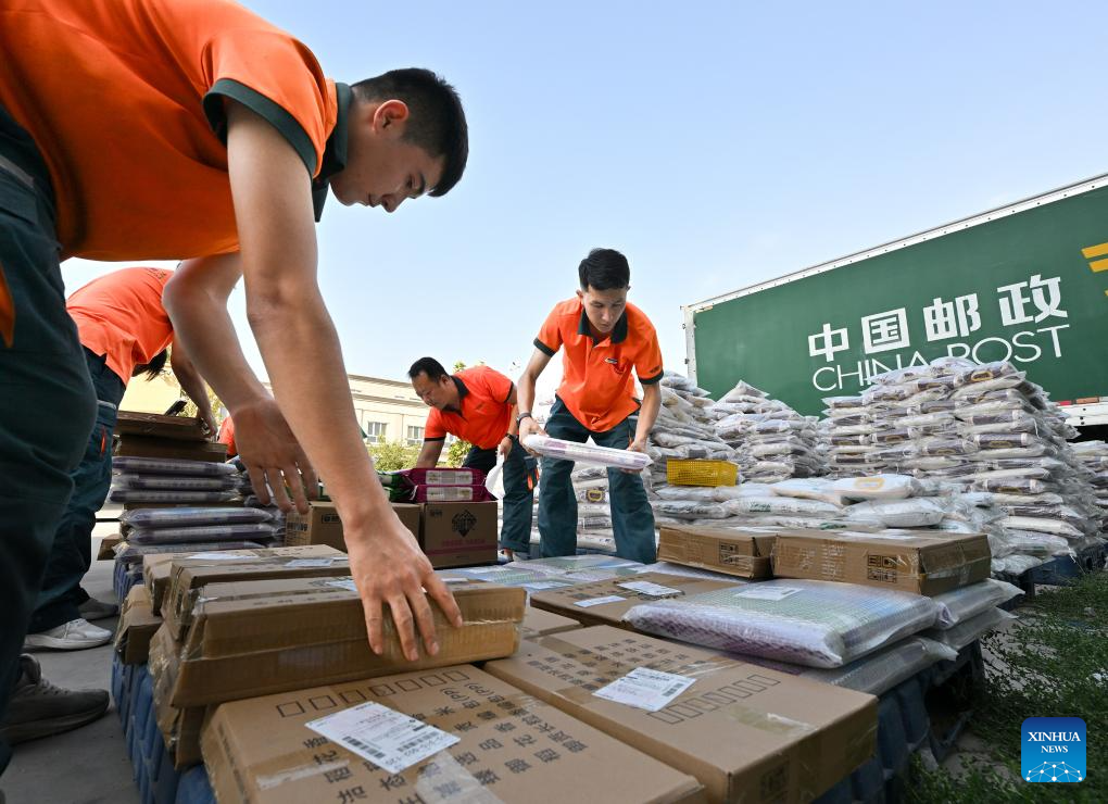 A postman (R) collects goods delivered by a merchant in Horgos, northwest China's Xinjiang Uygur Autonomous Region, Sept. 10, 2025. By the end of this August, China Post Horgos Branch has processed more than 410,000 pieces of mails. In recent years, the Xinjiang Branch of China Post has extended its postal services to local communities of remote area and border outposts. Additionally, it has built a high-quality agricultural product supply chain across the region, facilitating the sales of local premium agricultural products and contributing to rural revitalization.