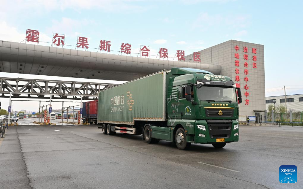 A postal truck leaves the comprehensive bonded zone of Horgos in Horgos, northwest China's Xinjiang Uygur Autonomous Region, Sept. 11, 2025. The exchange station in Horgos was officially put into operation in July of 2022, providing comprehensive solutions for warehousing and logistics of cross-border e-commerce industry chain. Over the past three years, it has exchanged 2,026 tons of international mail in total. In recent years, the Xinjiang Branch of China Post has extended its postal services to local communities of remote area and border outposts. Additionally, it has built a high-quality agricultural product supply chain across the region, facilitating the sales of local premium agricultural products and contributing to rural revitalization.