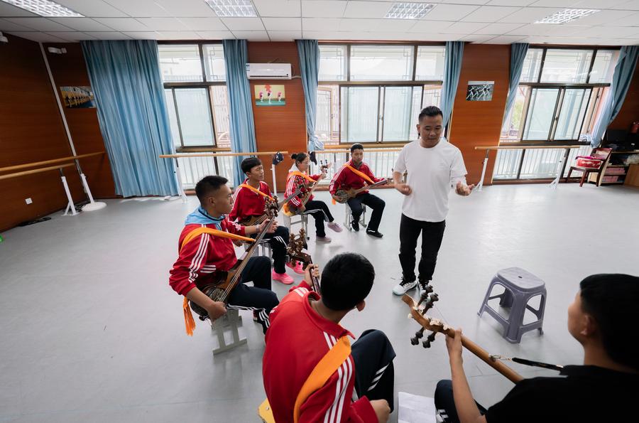 A teacher teaches students the playing skills of Zhanian, a traditional Tibetan stringed instrument, at a secondary vocational and technical school in Lhasa, southwest China's Xizang Autonomous Region, Sept. 9, 2025. (Xinhua/Zhang Xiaoyu)
