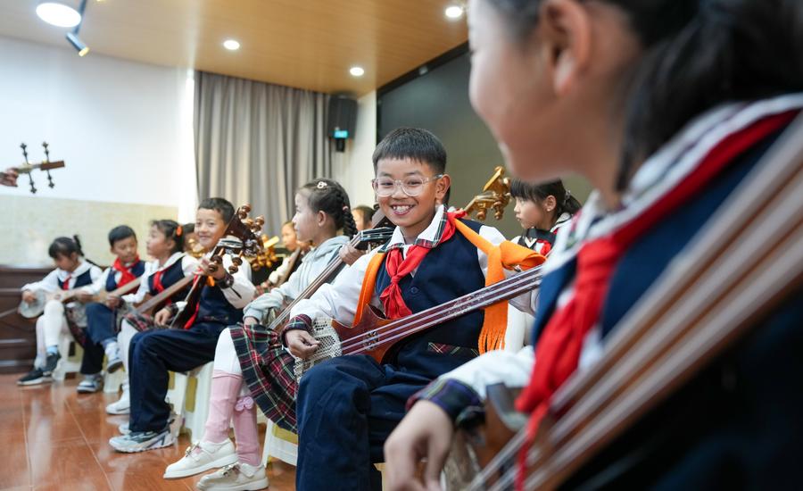 Students play Zhanian, a traditional Tibetan stringed instrument, at Lhasa Experimental Primary School in Lhasa, southwest China's Xizang Autonomous Region, Sept. 11, 2025. (Xinhua/Jigme Dorje)