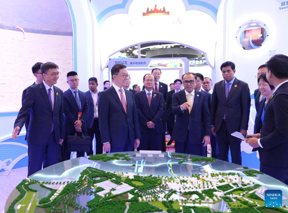 Chinese Vice President Han Zheng visits the exhibition of the 22nd China-ASEAN Expo and communicates with exhibitors after the opening ceremony of the expo and China-ASEAN Business and Investment Summit in Nanning, south China's Guangxi Zhuang Autonomous Region, Sept. 17, 2025. Han addressed the opening ceremony on Wednesday. (Xinhua/Ding Lin)