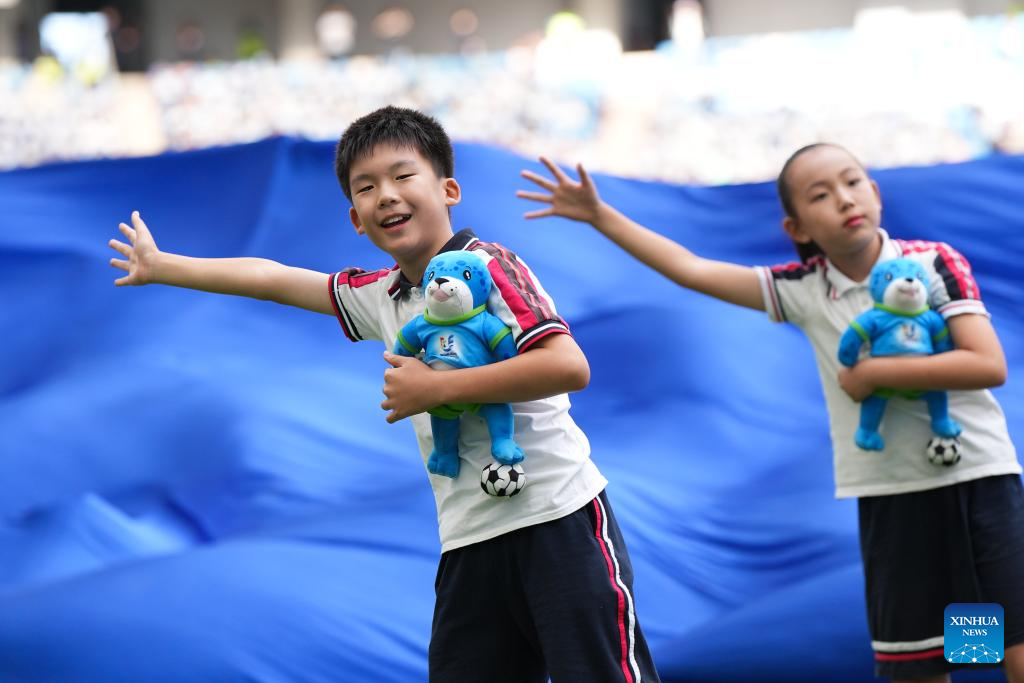 Children perform during the opening ceremony of the 2025 FISU University World Cup Football held in Suoyuwan Stadium in Dalian, northeast China's Liaoning Province, Sept. 17, 2025. (Xinhua/Zheng Huansong)