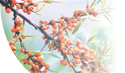 Sea buckthorn thrives in Huachi's harsh environment, withstanding cold, drought and sand. The hardy plant grows on mountain slopes, sandy soils and soft sandstone, even with limited rainfall.