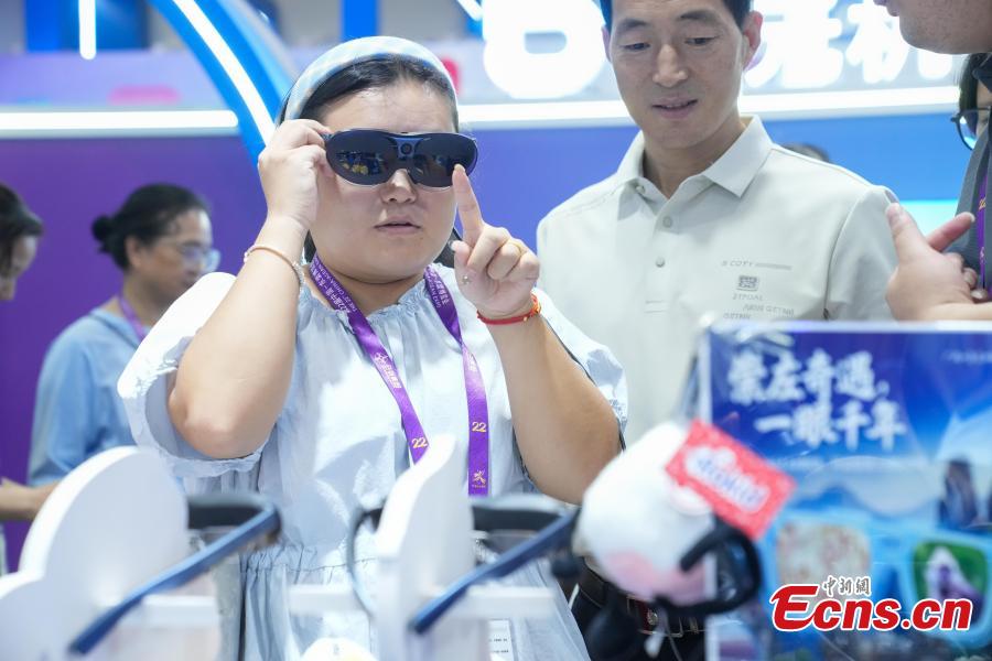 A visitor wears augmented reality (AR) glasses to appreciate the scenery of Chongzuo, a city in Guangxi, at the 22nd China-ASEAN Expo in Nanning, Guangxi Zhuang Autonomous Region, Sept. 17, 2025. (Photo: China News Service/Chen Guanyan)