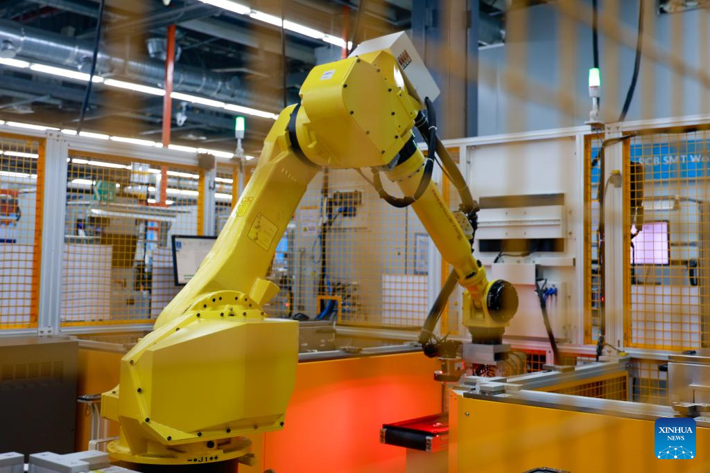 A robotic arm operates at an automated testing station of Jabil Circuit (Wuxi) Co., Ltd. at Wuxi Hi-Tech District Comprehensive Bonded Zone in Wuxi, east China's Jiangsu Province, on Sept. 15, 2025. (Xinhua/Liu Jiaqi)