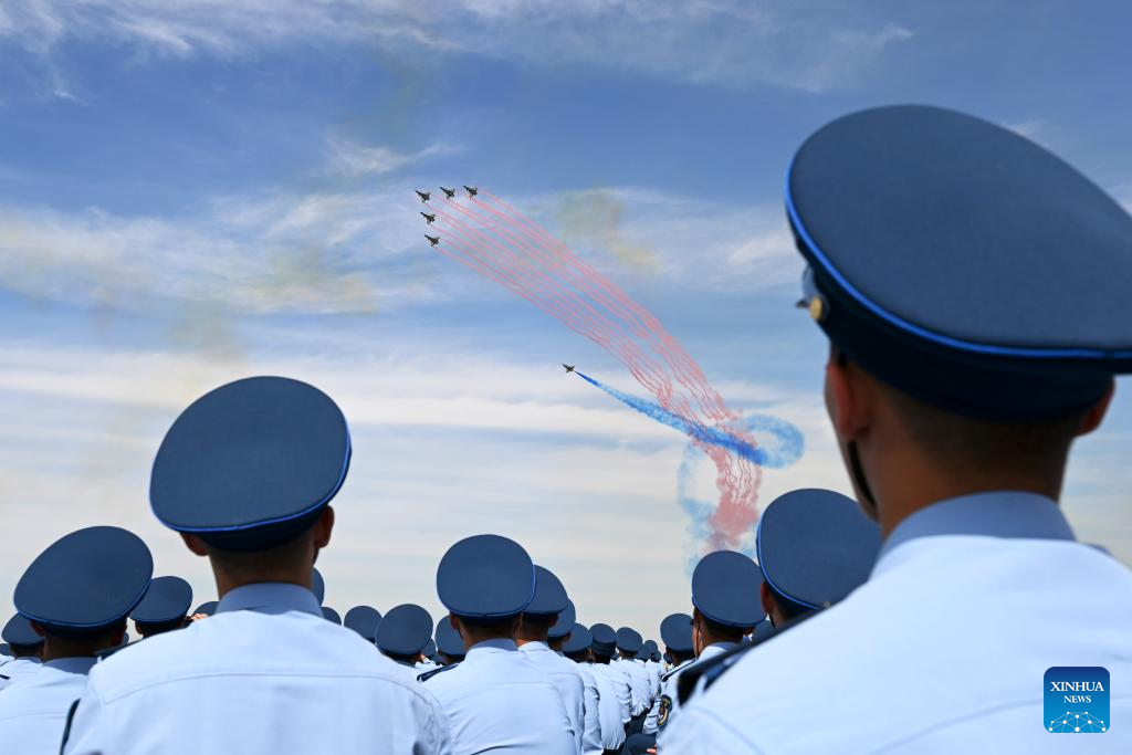 Aircraft of the Bayi Aerobatic Team of the Chinese People's Liberation Army Air Force perform during the 2025 aviation open-day activities of the Chinese People's Liberation Army Air Force and Changchun Air Show in Changchun, northeast China's Jilin Province, Sept. 19, 2025. The events kicked off here on Friday. (Xinhua/Yan Linyun)