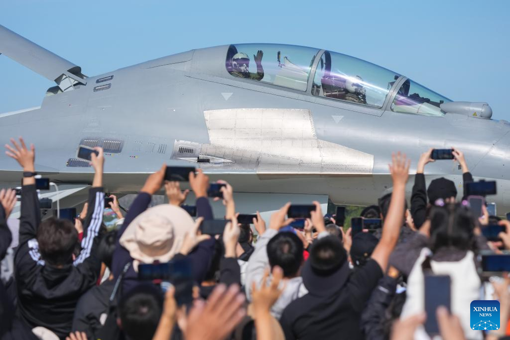 Pilots of a J-16 fighter jet greet the audience during the 2025 aviation open-day activities of the Chinese People's Liberation Army Air Force and Changchun Air Show in Changchun, northeast China's Jilin Province, Sept. 19, 2025. The events kicked off here on Friday. (Xinhua/Yan Linyun)