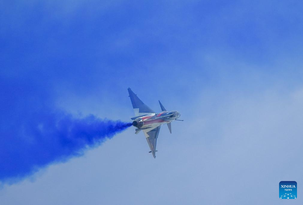 An aircraft of the Bayi Aerobatic Team of the Chinese People's Liberation Army Air Force performs during the 2025 aviation open-day activities of the Chinese People's Liberation Army Air Force and Changchun Air Show in Changchun, northeast China's Jilin Province, Sept. 19, 2025. The events kicked off here on Friday. (Xinhua/Yan Linyun)