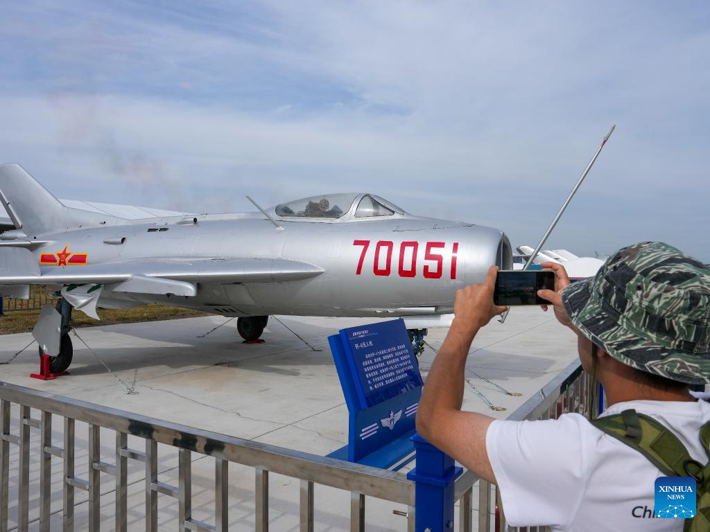 A man takes photos of a modified pilotless J-6 aircraft during the 2025 aviation open-day activities of the Chinese People's Liberation Army Air Force and Changchun Air Show in Changchun, northeast China's Jilin Province, Sept. 19, 2025. The events kicked off here on Friday. (Xinhua/Zhang Nan)
