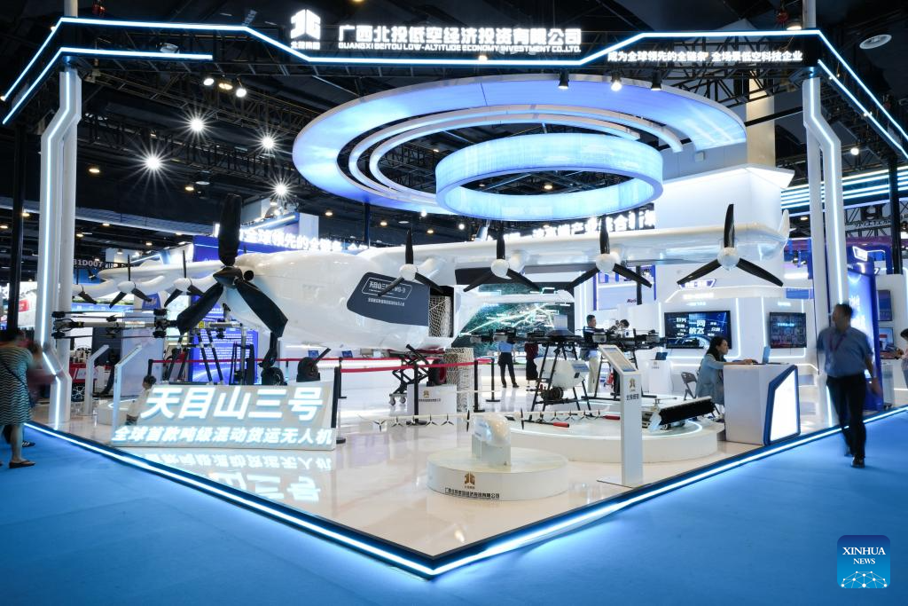 This photo taken on Sept. 19, 2025 shows the booth of Guangxi Beitou Low-altitude Economy Investment Co., Ltd. at the Nanning International Convention and Exhibition Center in Nanning, capital of south China's Guangxi Zhuang Autonomous Region. Products involving cutting-edge technologies such as artificial intelligence, low-altitude economy and humanoid robots are showcased during the ongoing 22nd China-ASEAN Expo.