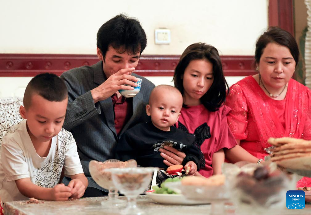 Metkasim Manglik dips a Naan into herbal tea at home in Qira County, northwest China's Xinjiang Uygur Autonomous Region, Sept. 5, 2025. (Xinhua/Wang Fei)