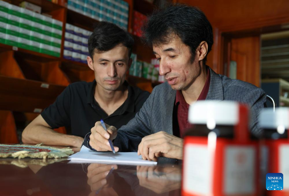Metkasim Manglik (R) teaches his nephew to prepare herbal tea at his herbal tea shop in Qira County, northwest China's Xinjiang Uygur Autonomous Region, Sept. 5, 2025. (Xinhua/Wang Fei)