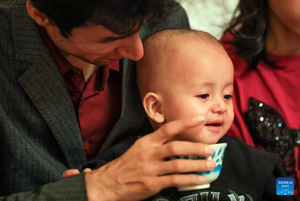 Metkasim Manglik holding his son poses for a photo at home in Qira County, northwest China's Xinjiang Uygur Autonomous Region, Sept. 5, 2025. (Xinhua/Wang Fei)