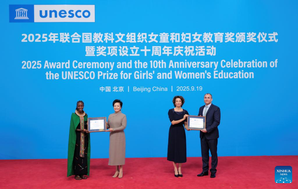 BEIJING, Sept. 19 (Xinhua) -- Peng Liyuan, wife of Chinese President Xi Jinping, and Audrey Azoulay, director-general of the United Nations Educational, Scientific and Cultural Organization (UNESCO), attended the 2025 UNESCO Prize for Girls' and Women's Education award ceremony and the 10th anniversary celebration of the prize in Beijing on Friday.