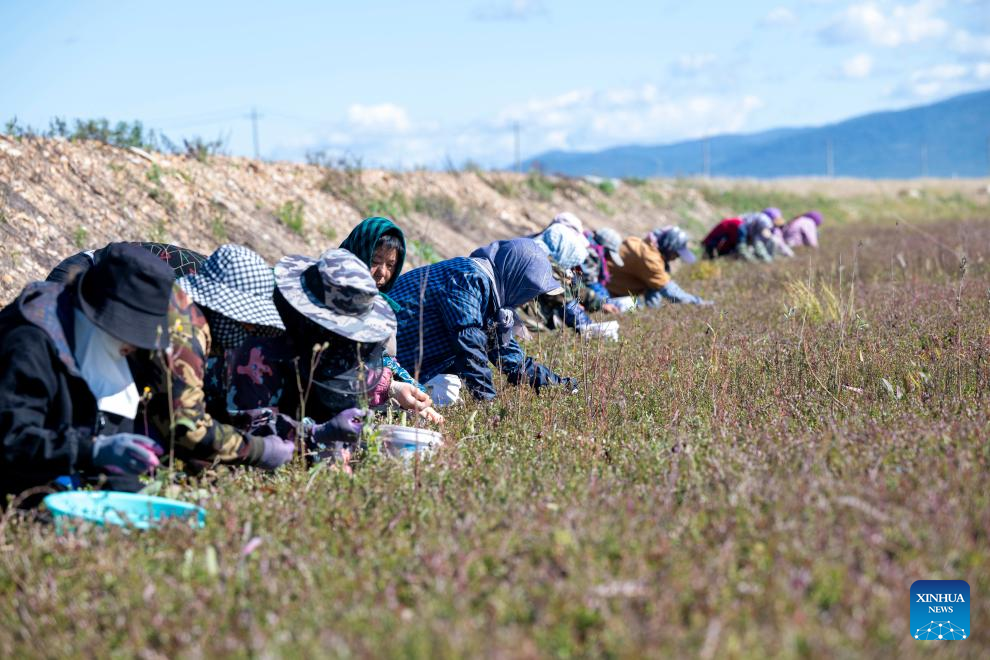 Workers harvest cranberries at a cranberry planting base in Fuyuan, northeast China's Heilongjiang Province, on Sept. 21, 2025. A cranberry harvest festival was held on Sunday in Fuyuan, a leading hub for large-scale cranberry cultivation in China. (Xinhua/Zhang Tao)