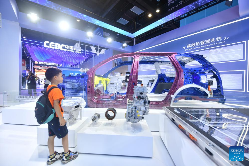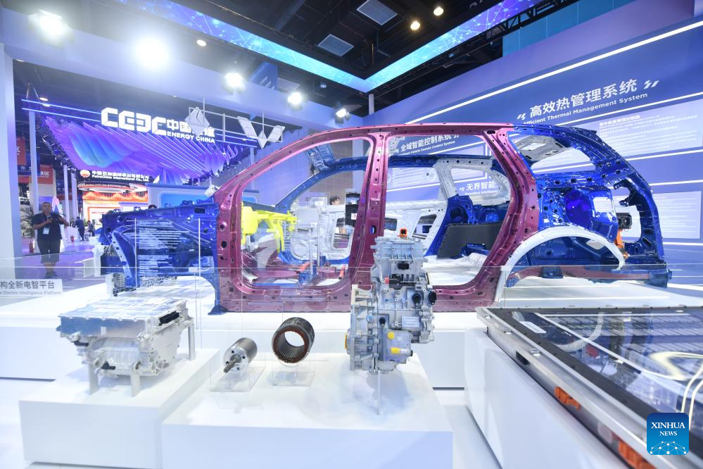 People view an electric vehicle produced in Liuzhou during the 22nd China-ASEAN Expo in Nanning, south China's Guangxi Zhuang Autonomous Region, Sept. 20, 2025. At the ongoing 22nd China-ASEAN Expo, new energy vehicles produced in Liuzhou of Guangxi and empowered by artificial intelligence draw wide attention from both domestic and overseas businesses and visitors. (Xinhua/Zhou Tinglu)