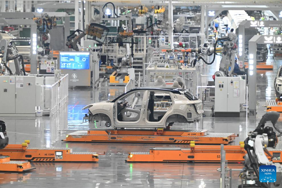 This photo taken on Sept. 9, 2025 shows an automatic production line of SAIC GM Wuling Automobile in Liuzhou, south China's Guangxi Zhuang Autonomous Region. At the ongoing 22nd China-ASEAN Expo, new energy vehicles produced in Liuzhou of Guangxi and empowered by artificial intelligence draw wide attention from both domestic and overseas businesses and visitors. (Photo by Li Hanchi/Xinhua)