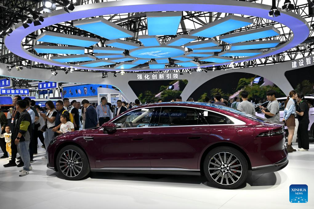 People visit a new energy vehicle displayed at the 2025 World Manufacturing Convention (WMC) in Hefei, east China's Anhui Province, Sept. 20, 2025. Themed "Intelligent Manufacturing For a Better Future", the 2025 WMC kicked off here on Saturday. (Xinhua/Zhou Mu)