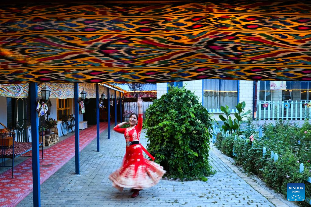 A guest from Kazakh ethnic group dances at the agritainment of Ma Xiuhua in Tacheng City, northwest China's Xinjiang Uygur Autonomous Region, Sept. 17, 2025.(Xinhua/Xin Yuewei)