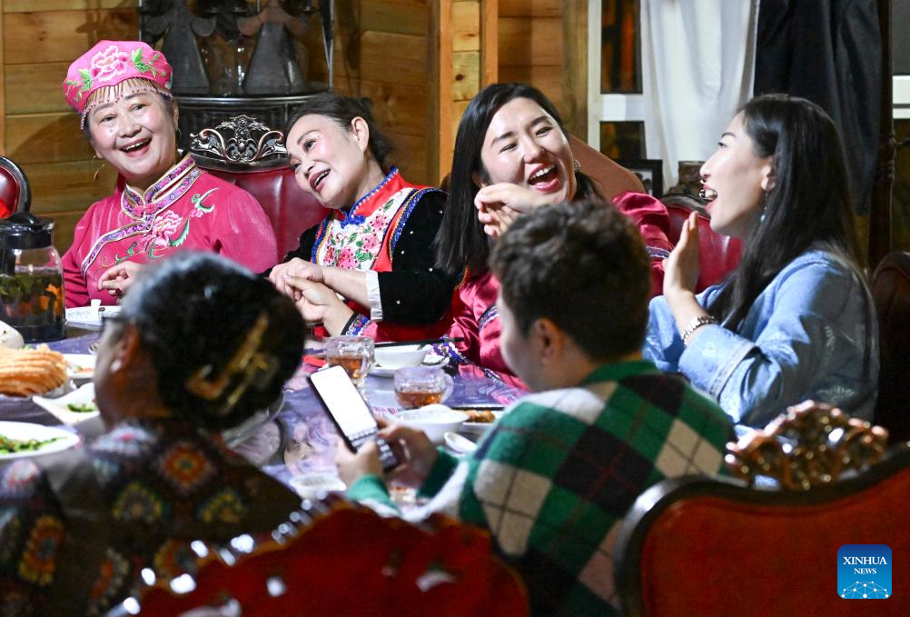 Guests from various ethnic groups sing during a meal at the agritainment of Ma Xiuhua in Tacheng City, northwest China's Xinjiang Uygur Autonomous Region, Sept. 17, 2025.(Xinhua/Xin Yuewei)