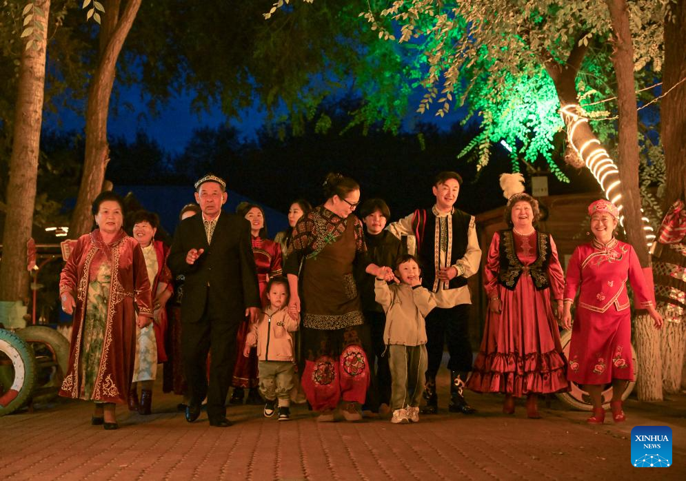 Guests from various ethnic groups are seen at the agritainment of Ma Xiuhua in Tacheng City, northwest China's Xinjiang Uygur Autonomous Region, Sept. 17, 2025.(Xinhua/Xin Yuewei)