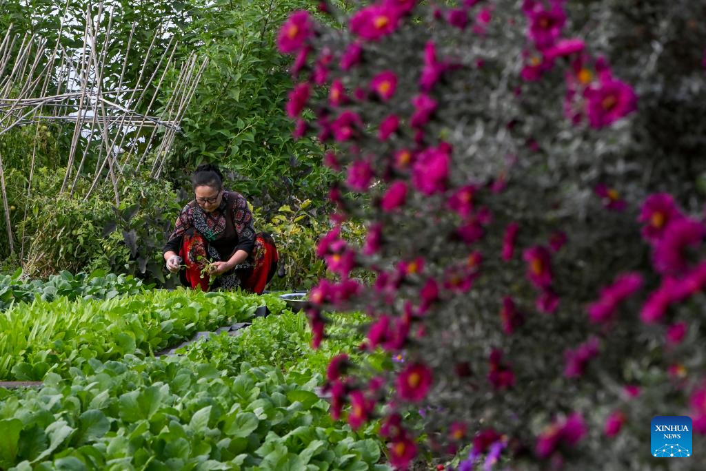 Ma Xiuhua harvests vegetables at her garden in Tacheng City, northwest China's Xinjiang Uygur Autonomous Region, Sept. 17, 2025.(Xinhua/Chen Shuo)