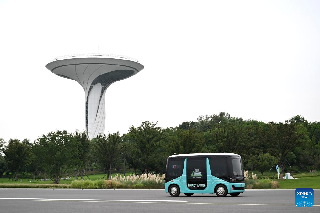 An autonomous sightseeing bus operates at Luogang park during the 2025 World Manufacturing Convention in Hefei, east China's Anhui Province, Sept. 21, 2025. The ongoing 2025 World Manufacturing Convention showcases wide-ranging applications of unmanned technology. The all-space unmanned systems exhibition of the convention becomes a must-see attraction for visitors. (Xinhua/Huang Bohan)