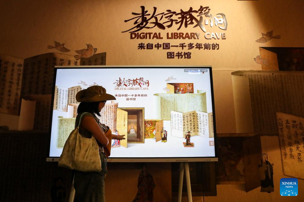 People visit an exhibition held by the Dunhuang Academy during the 8th Silk Road (Dunhuang) International Cultural Expo in Dunhuang, northwest China's Gansu Province, Sept. 22, 2025. More than 1,200 representatives from 97 countries and eight international organizations have gathered at the 8th Silk Road (Dunhuang) International Cultural Expo, which kicked off on Sunday in Dunhuang, a key hub on the ancient Silk Road in northwest China. (Xinhua/Lang Bingbing)