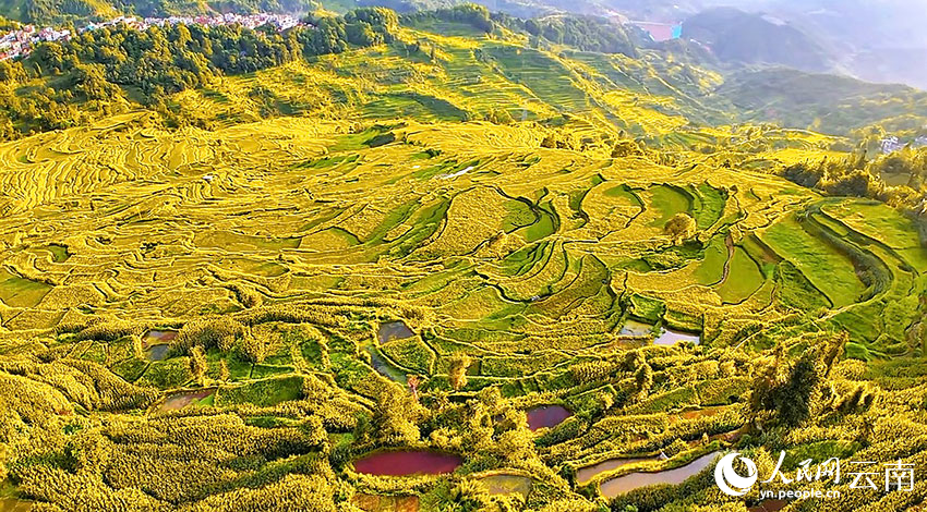 The Shier Longquan terraced fields in Honghe county, Honghe Hani and Yi Autonomous Prefecture, southwest China's Yunnan Province, burst with golden hues. (People's Daily Online/Li Ze'nyu)