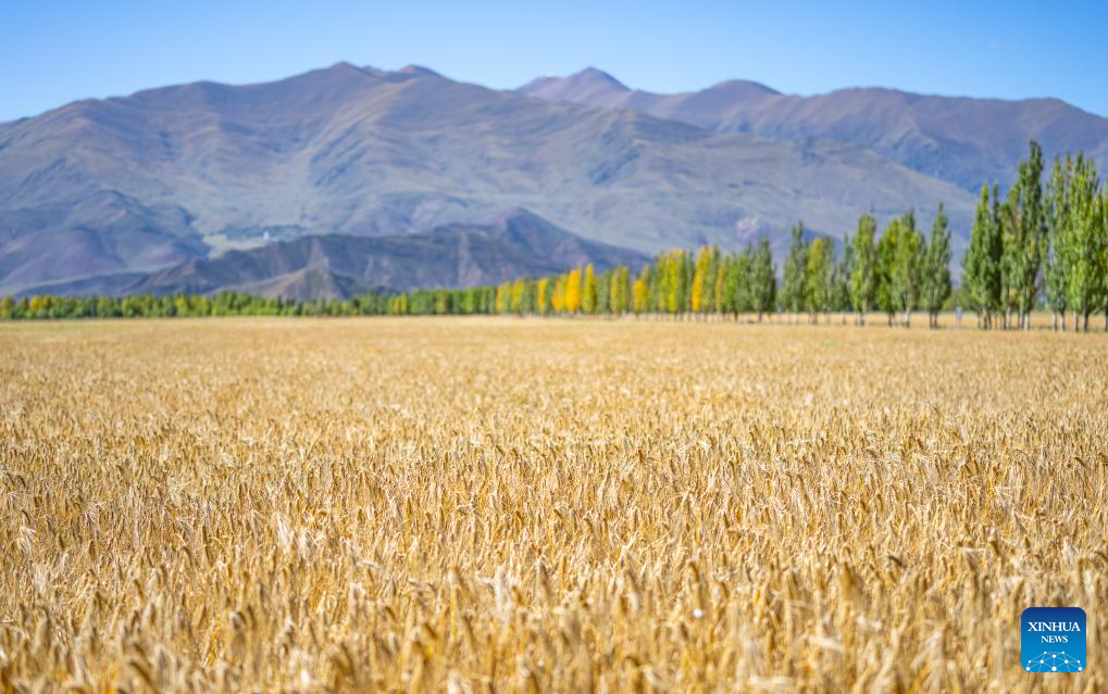 This photo taken on Sept. 23, 2025 shows a field of highland barley to be harvested in Lhunzhub County, in Lhasa, southwest China's Xizang Autonomous Region, Sept. 23, 2025. The Chinese farmers' harvest festival is the first national festival created specifically for the country's farmers. Starting in 2018, the festival coincides with the Autumnal Equinox each year, which is one of the 24 solar terms of the Chinese lunisolar calendar and usually falls between Sept. 22 and 24 during the country's agricultural harvest season. (Xinhua/Tenzin Nyida)