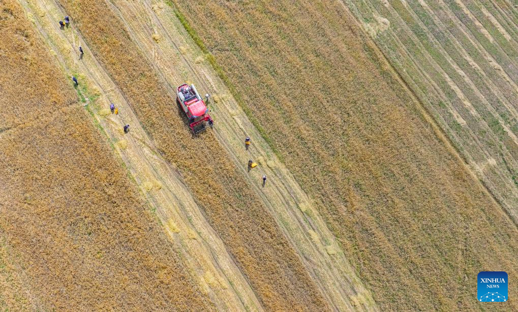 Farmers harvest highland barley with a harvester in Lhunzhub County, in Lhasa, southwest China's Xizang Autonomous Region, Sept. 23, 2025. The Chinese farmers' harvest festival is the first national festival created specifically for the country's farmers. Starting in 2018, the festival coincides with the Autumnal Equinox each year, which is one of the 24 solar terms of the Chinese lunisolar calendar and usually falls between Sept. 22 and 24 during the country's agricultural harvest season. (Xinhua/Tenzin Nyida)