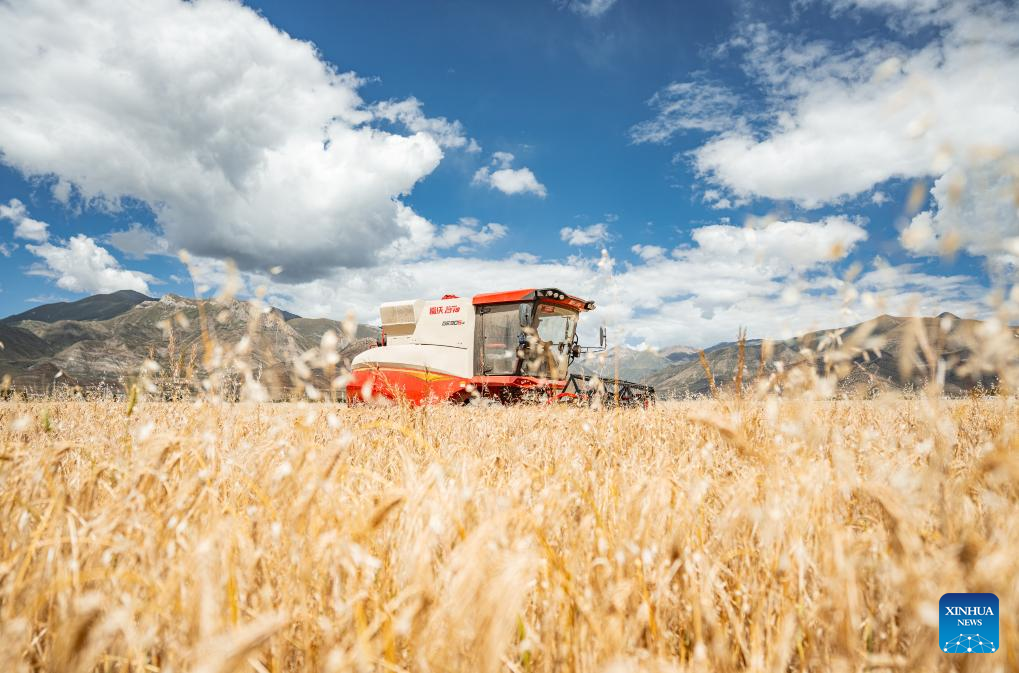 A harvester works in a highland barley field in Lhunzhub County, in Lhasa, southwest China's Xizang Autonomous Region, Sept. 23, 2025. The Chinese farmers' harvest festival is the first national festival created specifically for the country's farmers. Starting in 2018, the festival coincides with the Autumnal Equinox each year, which is one of the 24 solar terms of the Chinese lunisolar calendar and usually falls between Sept. 22 and 24 during the country's agricultural harvest season. (Xinhua/Tenzin Nyida)