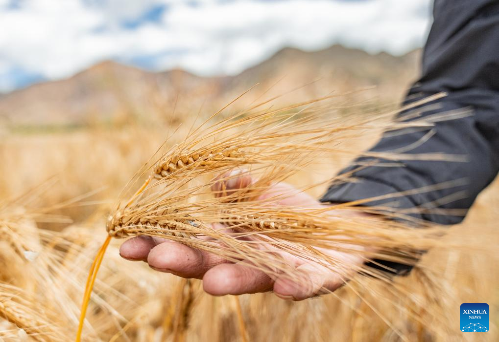 A farmer holds highland barley ears in Lhunzhub County, in Lhasa, southwest China's Xizang Autonomous Region, Sept. 23, 2025. The Chinese farmers' harvest festival is the first national festival created specifically for the country's farmers. Starting in 2018, the festival coincides with the Autumnal Equinox each year, which is one of the 24 solar terms of the Chinese lunisolar calendar and usually falls between Sept. 22 and 24 during the country's agricultural harvest season. (Xinhua/Tenzin Nyida)