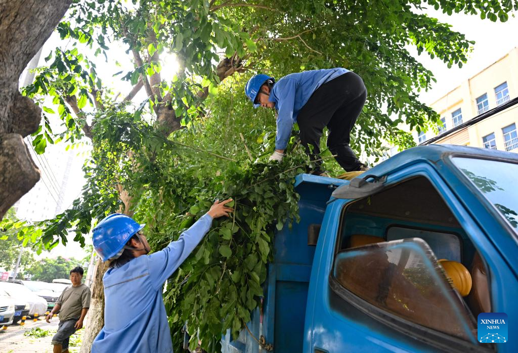 Workers trim branches near wires in Haikou, south China's Hainan Province, Sept. 23, 2025. Typhoon Ragasa is expected to impact the island province of Hainan, with the provincial capital Haikou to suspend classes, ferry services, park operations, work and business activities starting later on Tuesday or Wednesday. All train services to and from the island will be canceled on Wednesday. (Xinhua/Guo Cheng)