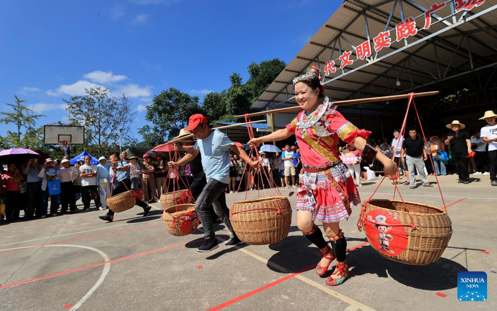 Farmers participate in a rice-carrying relay race at the Chinese farmers' harvest festival celebrations in Liangbei Village, Liuzhou City, south China's Guangxi Zhuang Autonomous Region, Sept. 23, 2025. The Chinese farmers' harvest festival is the first national festival created specifically for the country's farmers. Starting in 2018, the festival coincides with the Autumnal Equinox each year, which is one of the 24 solar terms of the Chinese lunisolar calendar and usually falls between Sept. 22 and 24 during the country's agricultural harvest season. (Photo by Tan Kexing/Xinhua)