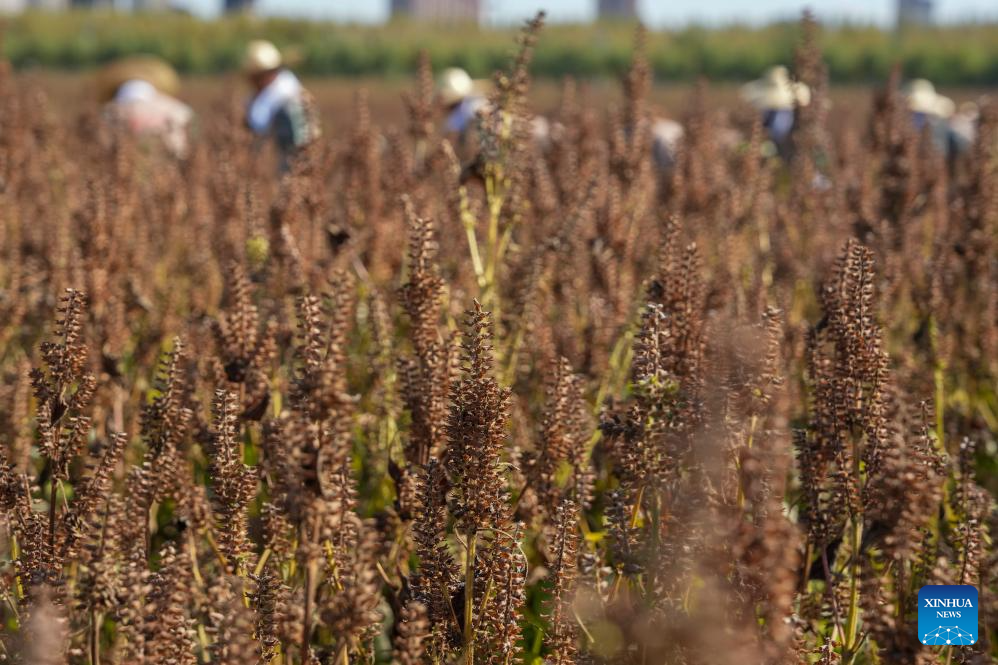 Staff demonstrate how to harvest perilla at the Chinese farmers' harvest festival celebrations in Huanan County, Jiamusi City, northeast China's Heilongjiang Province, Sept. 23, 2025. The Chinese farmers' harvest festival is the first national festival created specifically for the country's farmers. Starting in 2018, the festival coincides with the Autumnal Equinox each year, which is one of the 24 solar terms of the Chinese lunisolar calendar and usually falls between Sept. 22 and 24 during the country's agricultural harvest season. (Xinhua/Wang Jianwei)
