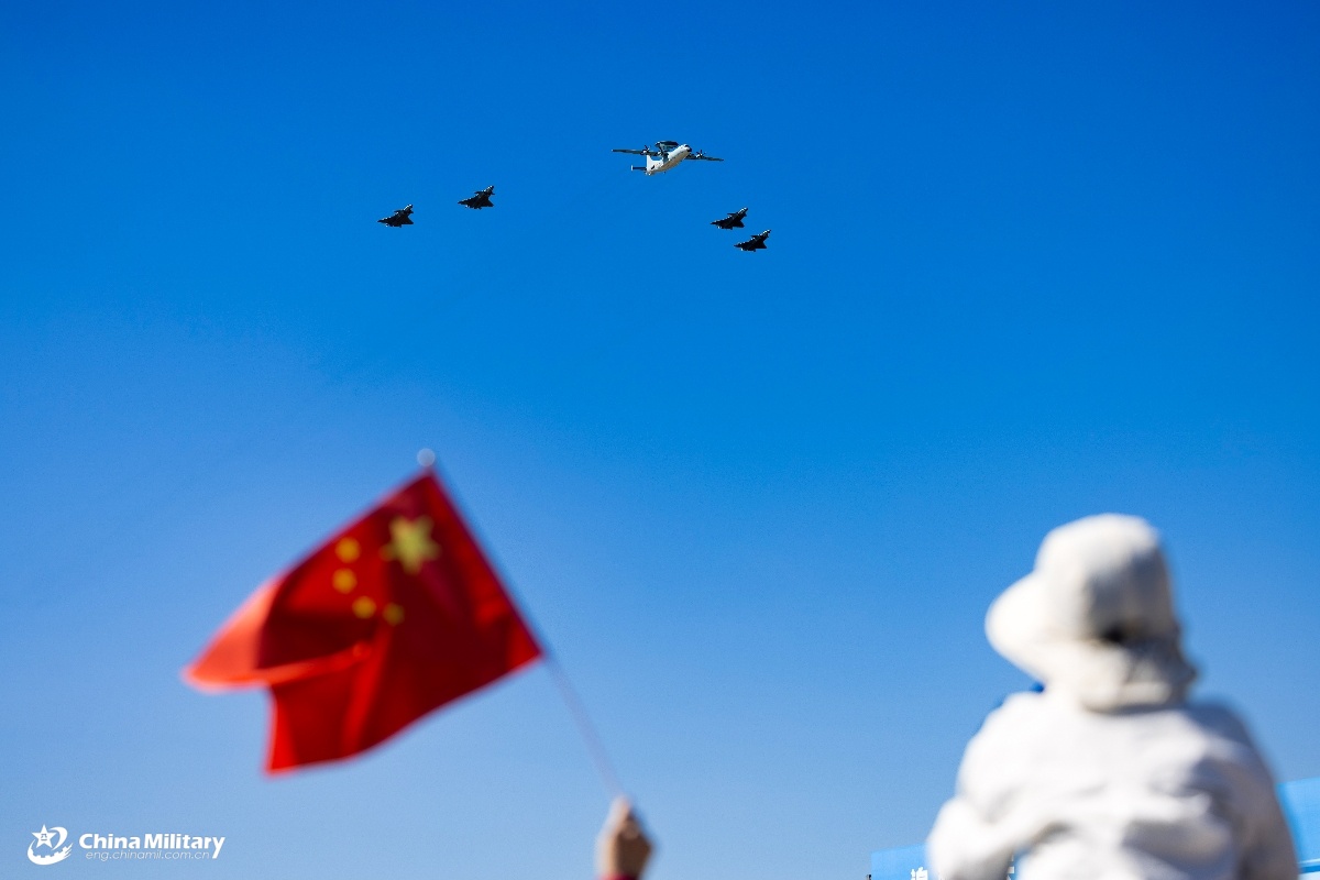 A KJ-500 airborne early warning (AEW) aircraft and four J-20 stealth fighter jets attached to the Chinese PLA Air Force fly in formation during the 2025 aviation open-day activities of the Chinese PLA Air Force and Changchun Air Show in Changchun City, northeast China's Jilin Province, on September 21, 2025. (eng.chinamil.com.cn/Photo by Xu Dong)